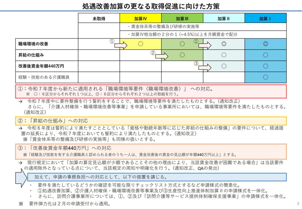 さらに、昇給制度をきちんと整えることや、経験・技能のある職員の年収を440万円以上にすること、介護福祉士等の配置を進めるための体制加算を取得することなどで、より上位区分の加算を取得できるようになりました。