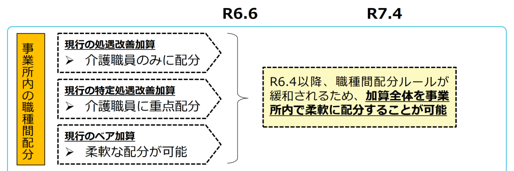 令和6年度からの処遇改善加算では、基本的には介護職員に重点的に配分する方針を維持しながらも、管理者・生活相談員・看護師・機能訓練員など、他職種にも柔軟に配分できるようになりました。